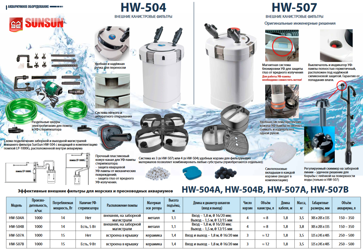 Внешний канистровый фильтр SunSun HW-504, 4 корзины, 14 Вт, 800 л/чЭффективный внешний фильтр подходит для всех видов