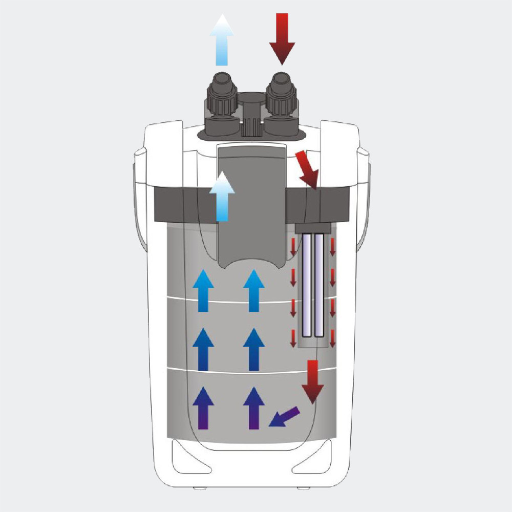 SunSun HW-702B - внешний канистровый фильтр с мотором производительностью 1000 л/ч и интегрированной 9 Вт УФ лампой. Главная особенность фильтра SunSun HW-702B – это интегрированная УФ лампа. Поток воды при прохождении через фильтр сначала попадает в отсек с УФ лампой. Одноклеточные водоросли, вызывающие «цветение» воды и другие нежелательные микроорганизмы, в т.ч.патогенные, разрушаются уже при входе в фильтр. УФ излучение разрушает водоросли и бактерии при прохождении через соответствующий отсек фильтра. Очищенная от микроорганизмов вода попадает в следующие отсеки, где проходит уже механическую, биологическую и химическую (при наличии соответствующих наполнителей) очистку.